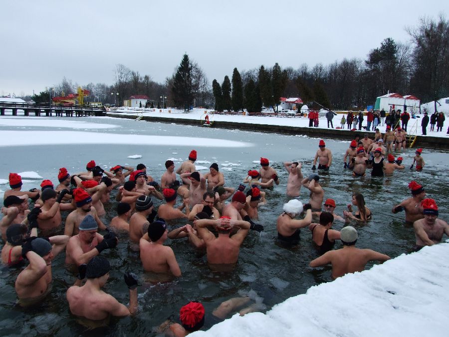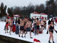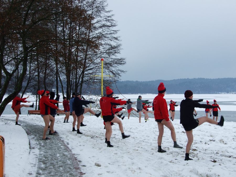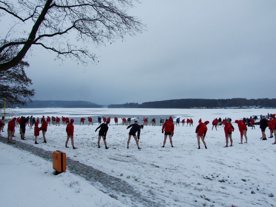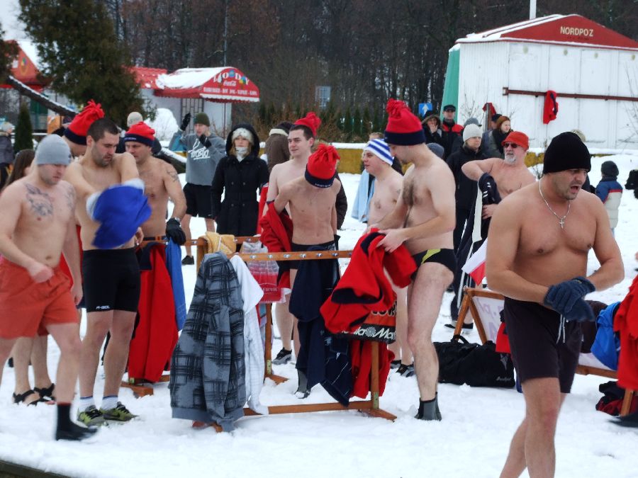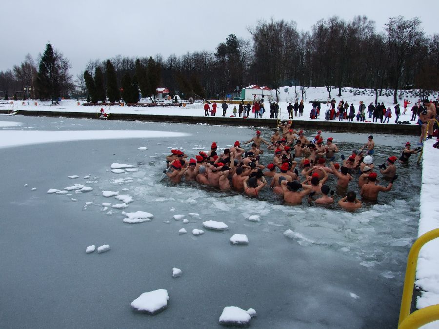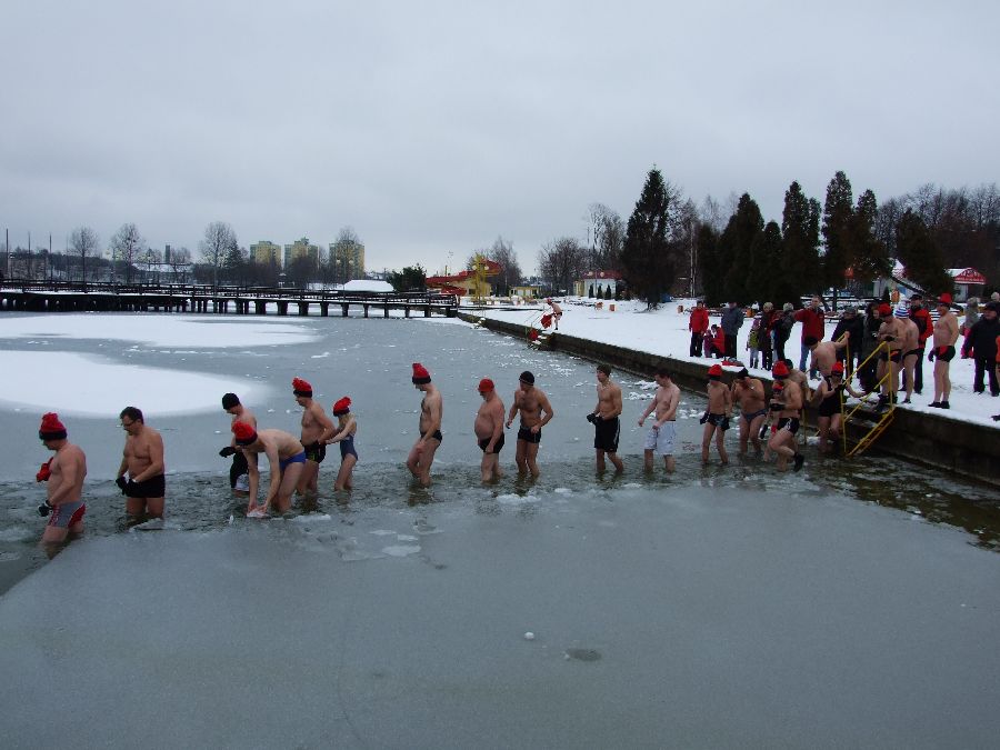 Lód cienki i ostry jak brzytwa, trzeba uważać. Ale nie zraziło to 85 morsów, a także całkiem dużej grupy kąpiących się po raz pierwszy. Temperatura wody 2 stopnie.