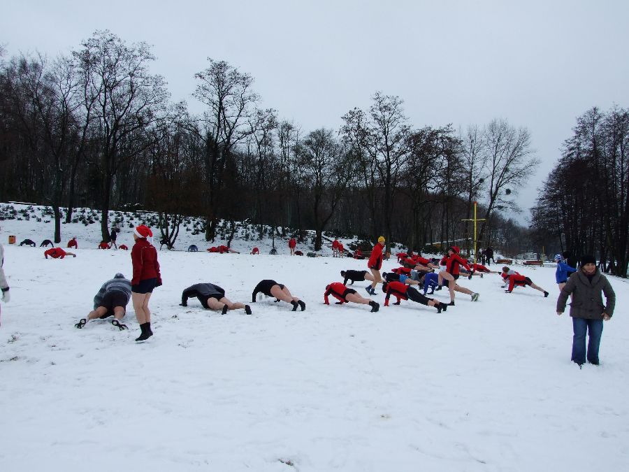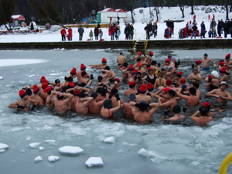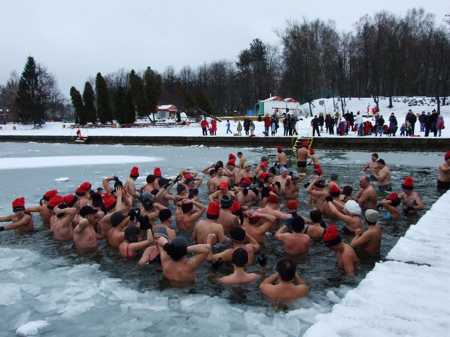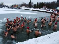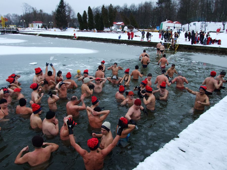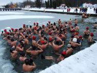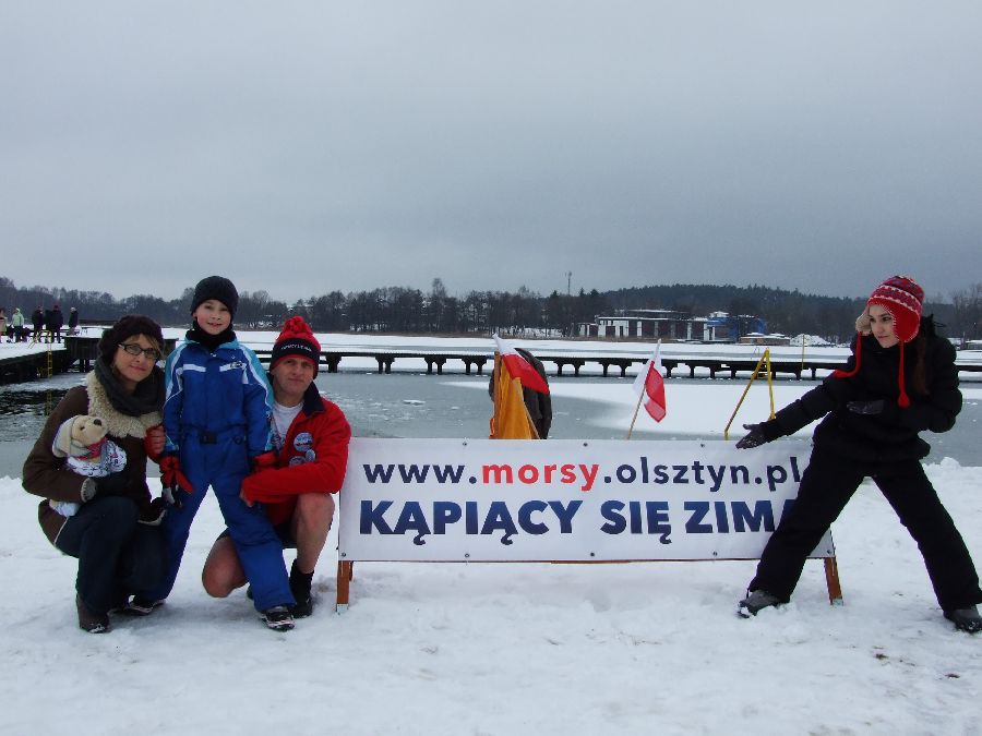 Lód cienki i ostry jak brzytwa, trzeba uważać. Ale nie zraziło to 85 morsów, a także całkiem dużej grupy kąpiących się po raz pierwszy. Temperatura wody 2 stopnie.